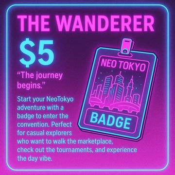 Add Start your NeoTokyo adventure with a badge to enter the convention. Perfect for casual explorers who want to walk the marketplace, check out the tournaments, and experience the day vibe a description about this item