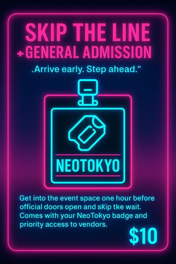 Get into the event space one hour before official doors open and skip the wait. Comes with your NeoTokyo badge and priority access to vendors and activities.
