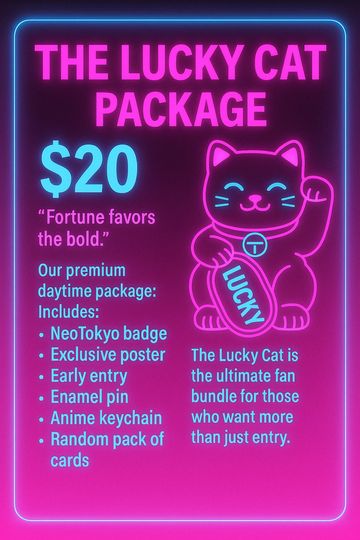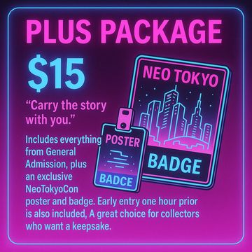 Includes everything from General Admission, plus an exclusive NeoTokyoCon poster and badge. Early entry one hour prior is also included. A great choice for collectors who want a keepsake.