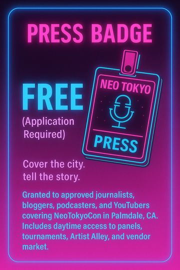 Granted to approved journalists, bloggers, podcasters, and YouTubers covering NeoTokyoCon in Palmdale, CA. Includes daytime access to panels, tournaments, Artist Alley, and vendor market.